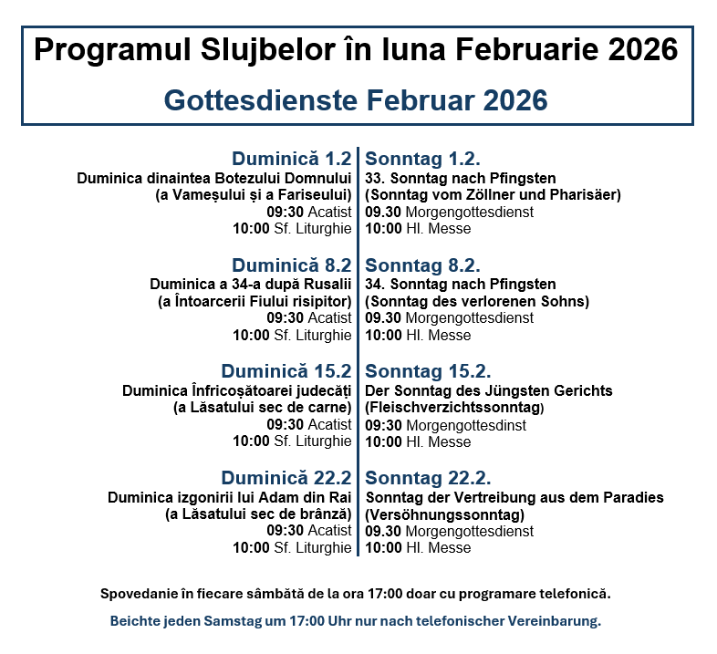 Acasă ⛪ Biserica Ortodoxa Română „Sfinții Ioachim și Ana” Waldshut-Tiengen 📍 Kalvarienberg Kapelle, Kalvarienbergstraße 14, 79761 Waldshut-Tiengen 📞 Pr. Dan Blajovan +49 174 9878157 ✉️ danblajovan@gmail.com